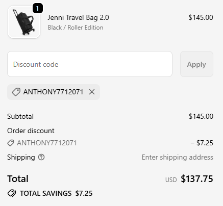 Use coupon code: ANTHONY7712071 and get 5% off your order from JenniBag. ![]() | |