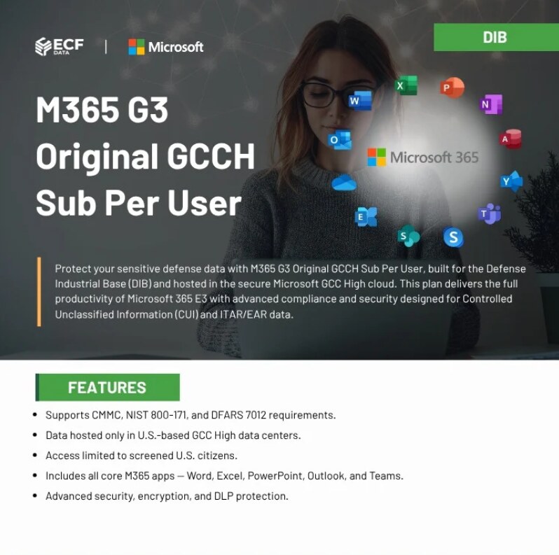 Secure your Defense Industrial Base (DIB) operations this Black Friday with the Microsoft 365 G3 Original GCCH Subscription, available now at ECF Cloud Solution Store. Designed for organizations managing Controlled Unclassified Information (CUI), this license runs on the Government Community Cloud High (GCCH) — providing the perfect balance of security, compliance, and productivity for CMMC Level 2 and Level 3 environments. • Compliant & Secure – Built for DFARS, ITAR, and NIST 800-171 standards • Complete Productivity Suite – Includes Teams, Exchange, SharePoint & Office desktop apps • U.S.-Only Data Residency – Operates within a fully segregated GCCH environment • Empowers Frontline & Office Users – Unified tools for collaboration and compliance • Trusted Microsoft Authorization – Purchase verified via Microsoft GCC High validation Black Friday Price: $61.10/user – Limited-time exclusive offer! Partner with ECF Data, a Microsoft Government Services (AOS-G) Partner, authorized to provide secure GCC High licensing for U.S. DIB contractors. Ensure full compliance, strengthen data protection, and empower your teams with a truly secure Microsoft 365 environment. Grab Your Offer Today: M365 G3 Original GCCH Sub Per User-DIB Sale Ends After Cyber Monday – Act Now! https://store.ecfdata.com/products/m365-g3-original-gcch-sub-per-user-dib ![]() | |