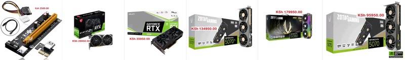 Brand New GRAPHIC CARDS PCI-E 1x to 16x Mining Machine Enhanced Riser Card Adapter with USB 3 and SATA Power Cable - 2500.00 Nvidia 2GB GT 730 Graphics card - 6950.00 NVIDIA GeForce 4GB GT 730 Graphics Card - 10950.00 NVIDIA GeForce 4GB GT 1030 Graphics Card - 15950.00 NVIDIA 4GB GeForce GTX 1650 GAMING Graphics Card - 26950.00 NVIDIA 6GB GeForce RTX 3050 Gaming Graphics Card - 29950.00 NVIDIA Geforce 8GB RTX 3050 Gaming Graphics Card - 35950.00 NVIDIA 12GB GeForce RTX 3060 Gaming Graphics Card - 54950.00 NVIDIA 12GB GeForce RTX 5070 Gaming Graphics Card - 95950.00 NVIDIA 16GB GeForce RTX 5070TI Gaming Graphics Card - 134950.00 Zotac Gaming GeForce RTX 5080 16GB Graphics Board - 179950.00 CONTACT : 0786 178372 or 0726 178372 LOCATION : Shop 501 (5th floor), Veteran House (Graffins college) Moi avenue, Nairobi Kenya ![]() | |