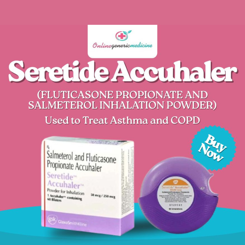 Seretide Inhaler and Seretide Accuhaler Inhaler, containing fluticasone propionate and salmeterol inhalation powder, are prescribed for effective asthma and COPD management. They work by reducing inflammation and improving airflow for easier breathing. With affordable Seretide Inhaler price and fluticasone salmeterol cost, you can conveniently buy from Online Generic Medicine ![]() | |