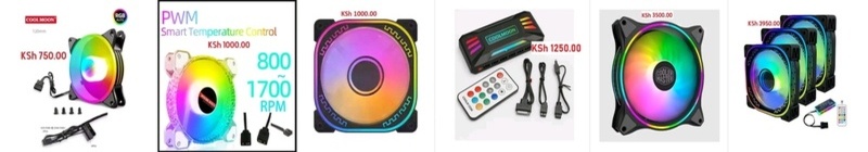 Brand New Case Fans 120MM Multi Color RGB CASE FAN {PWM and Molex} - 750.00 120MM 5v3pin and PWM interface ARGB CASE FAN - 1000.00 120MM 6pin Interface ARGB CASE FAN - 1000.00 LED_PWM ARGB computer case fan controller - 1250.00 140MM MasterFan MF140 Halo Gen 2 RGB Cooler Master CASE FAN - 3500.00 120MM 6pin interface ARGB CASE FAN with controller {3 pack} - 3950.00 CONTACT : 0786 178372 or 0726 178372 LOCATION : Shop 501 (5th floor), Veteran House (Graffins college) Moi avenue, Nairobi Kenya ![]() | |